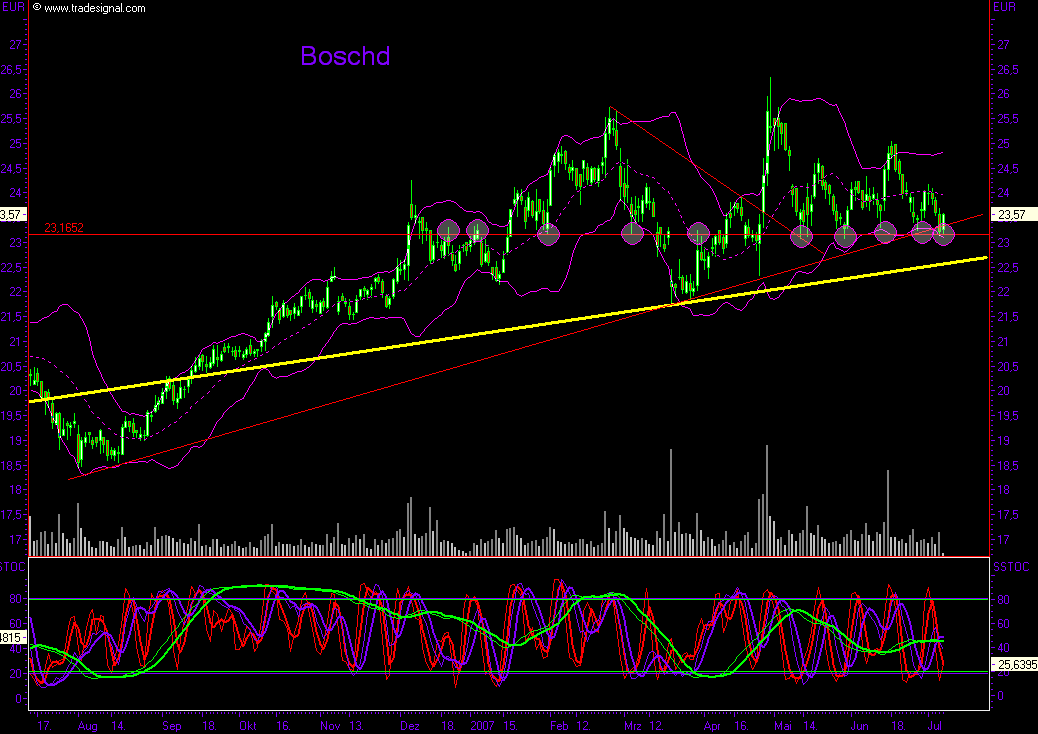Nach oben die nächsten Wiederstände bei 24€ gleichzeitig die Mittellinie der Bollinger und danach die 25€.