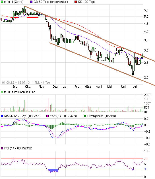 Nach 18 Mio Umsatz in HJ1 und einem Auftragsbestand von 23 Mio kann das Planziel Umsatz 38 Mio und eps 35 - 55 Cent in 2013 durchaus erreicht werden. Dabei bin ich für die Ergebnisseite zuversichtlich, da einige Restrukturierungseffekte (insbes. Personal) erst ab Hj.2 greifen werden. Wie das dann vor und nach Minderheiten aussieht... ist bei M-U-T ja immer ein Rätsel bis zum Schluss...
