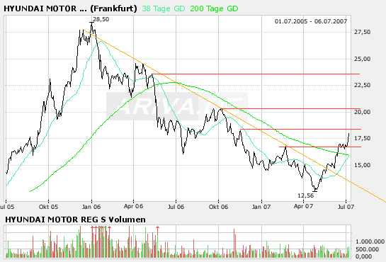 Rückblick: Die HYUNDAI MOTORS Aktie startete nach einem Tief bei 0,97 Euro im Oktober 1998 zu einer langfristigen Aufwärtsbewegung. Im Mai 2007 brach die Aktie dann über eine wichtige Pullbacklinie auf einem Niveau von 12,50 Euro nach oben aus. Bis Januar 2006 kletterte die Aktie auf ein Hoch bei 29,50 Euro. Von dort aus setzte eine massive Abwärtskorrektur ein. In der Endphase dieser Korrektur kam es im April 2007 zu einer bärischen Übertreibung. Denn die Aktie fiel kurzzeitig unter den zentralen Unterstützungsbereich um 13,27 Euro und markierte ein Tief bei 12,45 Euro. Seitdem zieht die Aktie wieder deutlich an. Den Abwärtstrend seit Januar 2006 hat sie bereits gebrochen.