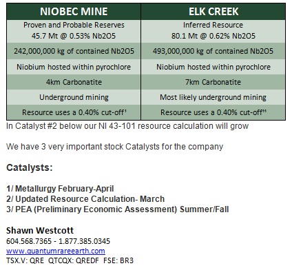 The US’ other alternative to Brazil is to encourage the development of niobium resources within its own borders; hence the USGS-funded research study on the Elk Creek deposit. Previously explored by Molycorp (NYSE:MCP) in the 1970s and 1980s, the property is now in the hands of Quantam Rare Earth Developments Corp. (TSXV:QRE) which has established an NI 43-101 compliant inferred resource of 80 million tons of 0.62% niobium.