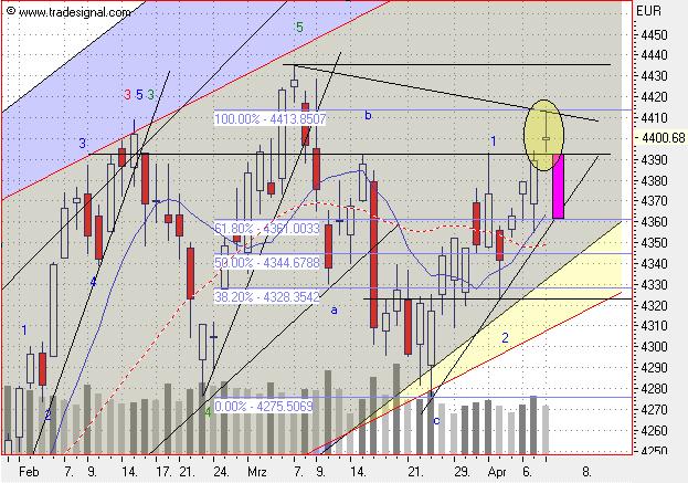Der Freitag war vorerst ein Zwischentop, der Uptrend ist intakt. Aber: die Freitagskerze läßt sich einerseits als Doji und andererseits als Shooting Star interpretieren (wenngleich für den Shooting Star die Lunte etwas lang erscheint). Die daraus resultierende Schlußfolgerung lautet deshalb auch: Es geht erstmal abwärts. Ob die eingezeichnete Montagskerze (magenta) tatsächlich die dargestellte Größe haben wird, weiß ich nicht. Aber das 61er RT bei 4.361 seit dem Anstieg von 4.275 bildet erst einmal eine Unterstützung, gleichzeitig liegt da der kurzfristige Uptrend. Weiterhin bietet sich dann das 50er RT bei 4.344 an.