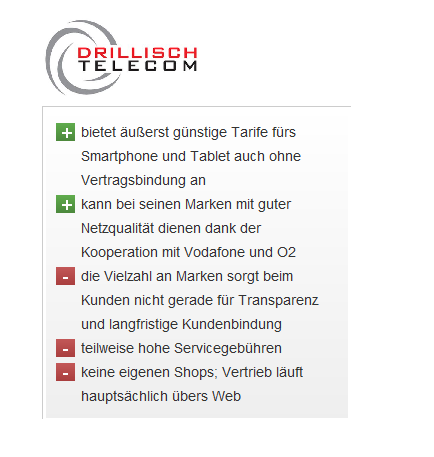 Mobilfunkmarkt Drillisch im Anbieter-Check 16.08.2013 - http://www.connect.de/ratgeber/...treiber-mobilfunkmarkt-1533173.html => "...Provider Drillisch setzt bei seiner Mehrmarken-Strategie eher auf Vielzahl statt auf Vielfalt. Einen Überblick über das Angebot verschafft unser Anbieter-Check. Seit 25 Jahren sind die Maintaler Drillisch als Service-Provider und virtueller Netzbetreiber (MVNO) im Mobilfunk tätig und sammeln Discount-Marken unter ihrem Dach wie andere Briefmarken: So gehören neben Simply, Hello Mobil, McSIM, Eteleon, DeutschlandSIM, Discotel, Discoplus, Discosurf, FastSIM auch die Billiganbieter WinSIM und M2M-mobil zu Drillisch. Dabei nutzt der Anbieter hauptsächlich die Mobilfunknetze von O2 und Vodafone und betreut als Service- Provider noch Bestandskunden im Telekom- und E-Plus-Netz. Der Mobilfunker lockt vor allem mit Tiefstpreisen: So verkaufen die Maintaler unter der Marke Smartmobil das Smartphone-Komplett-Bundle mit Sprache, SMS- und HSDPA-Flat mit bis zu schnellen 14,4 Mbit/s im Vodafone-Netz für sage und schreibe knapp 28 Euro pro Monat. Mit kreativer Vielfalt bei den Tarifen hält sich der Anbieter nicht auf, sondern bringt die nahezu gleichen Angebote bei all seinen Marken unter. Dafür verlangt Drillisch bei den meisten ihrer Mobilfunkprodukte auch keinerlei Vertragsbindung. =>---- Auf schnelle LTE-Zugänge müssen die Drillisch-Kunden bis auf Weiteres verzichten. ----<= Doch an attraktiven Mobilfunklösungen mangelt es nicht: So bietet der Betreiber unter der Marke Simply neuerdings eine Multi-SIM ohne Vertragsbindung an, mit der unter einer Rufnummer drei Endgeräte nutzbar sind. Allerdings ist der Provider wegen seine hohen Servicekosten berüchtigt.