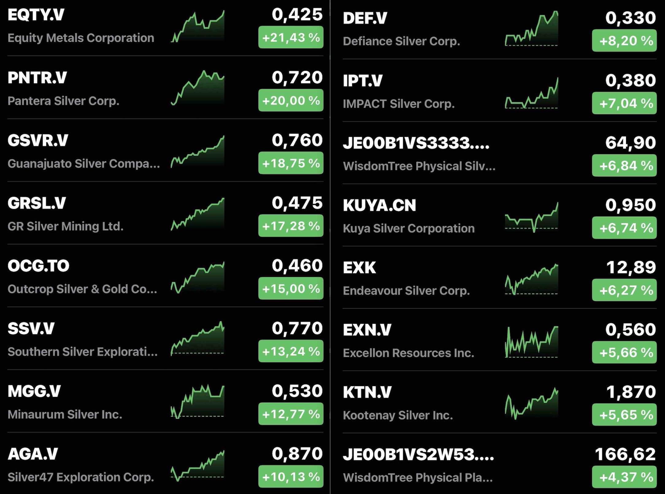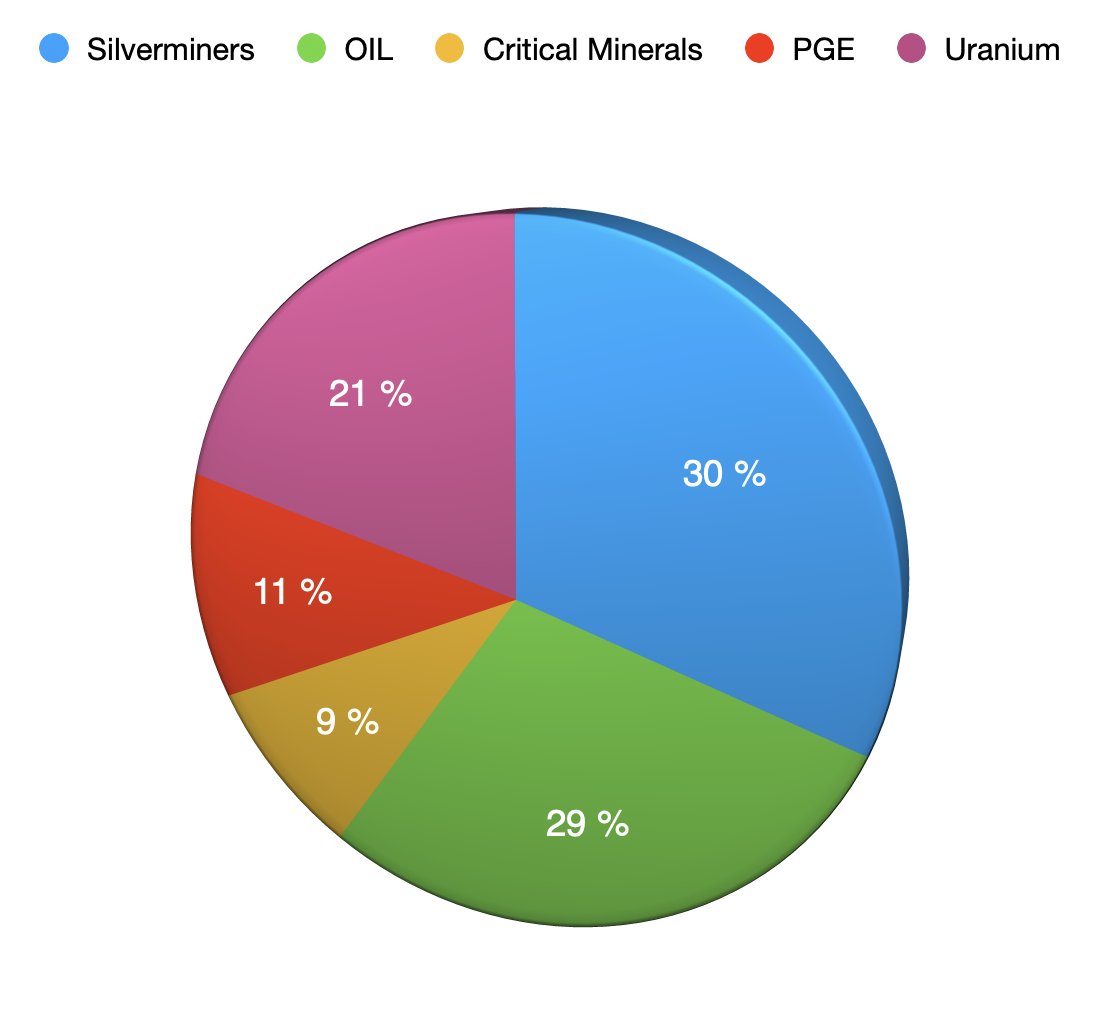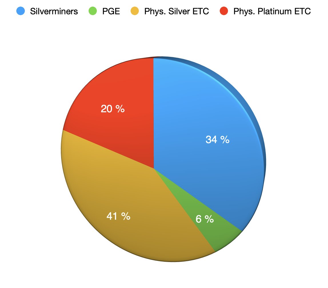 vor dem Silbercrash sah es so aus und ich war bei 30% Cash , 20% physisches und 50% Aktien (Siehe Liste) und hatte meine Silberminen schon stark reduziert (30% vom Aktienanteil) und war kurzzeitig in Öl ,Uran und REE unterwegs.Meine großen Silberminen hatte ich da schon verkauft.