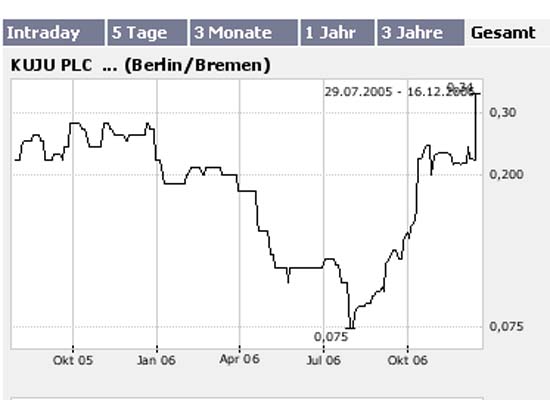 - Ende Juli 2007 sah der Kurs aus, als würde es bei KUJU dem Ende entgegen gehen und verglichen mit dem Kurs damals (ist ja erst 5 Monate her !!!) hätten wir einen Aufschlag von über 300% und das würde ich schon als sehr heftig empfinden, auch falls die KUJU-Programmierer zwischenzweitlich den einen oder anderen Renner programmiert haben sollten.