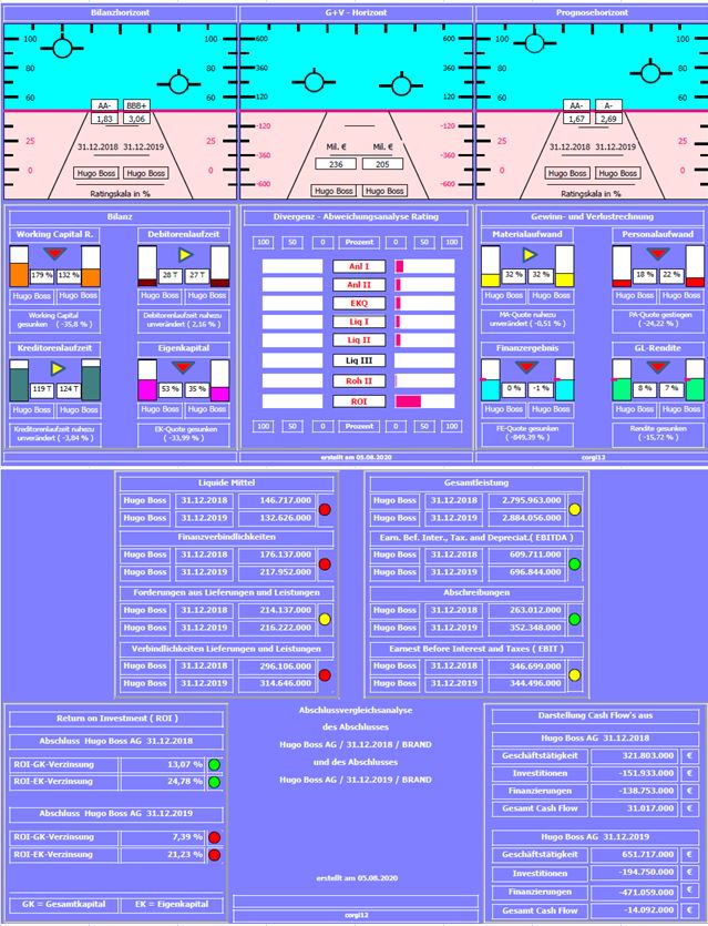 Was ist augenscheinlich: Die Bilanzratingnote hat sich von 1,67 auf 2,69 verschlechtert. Welche Faktoren (Kennzahlen) dazu beigetragen haben, kann an der Divergenzdarstellung abgelesen werden.