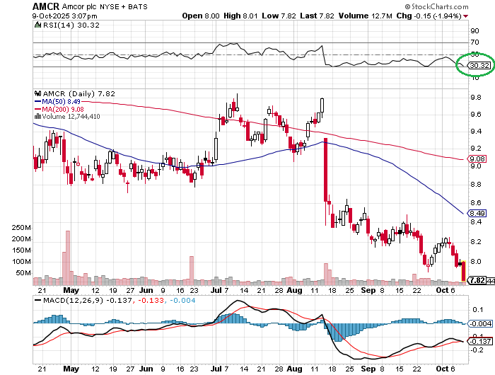 Unten der Kurs von Amcor, einer der weltweit führenden Pharma-Verpacker aus der Schweiz (Marktkapitalisierung: knapp 10 Mrd. Euro, KGV 28).