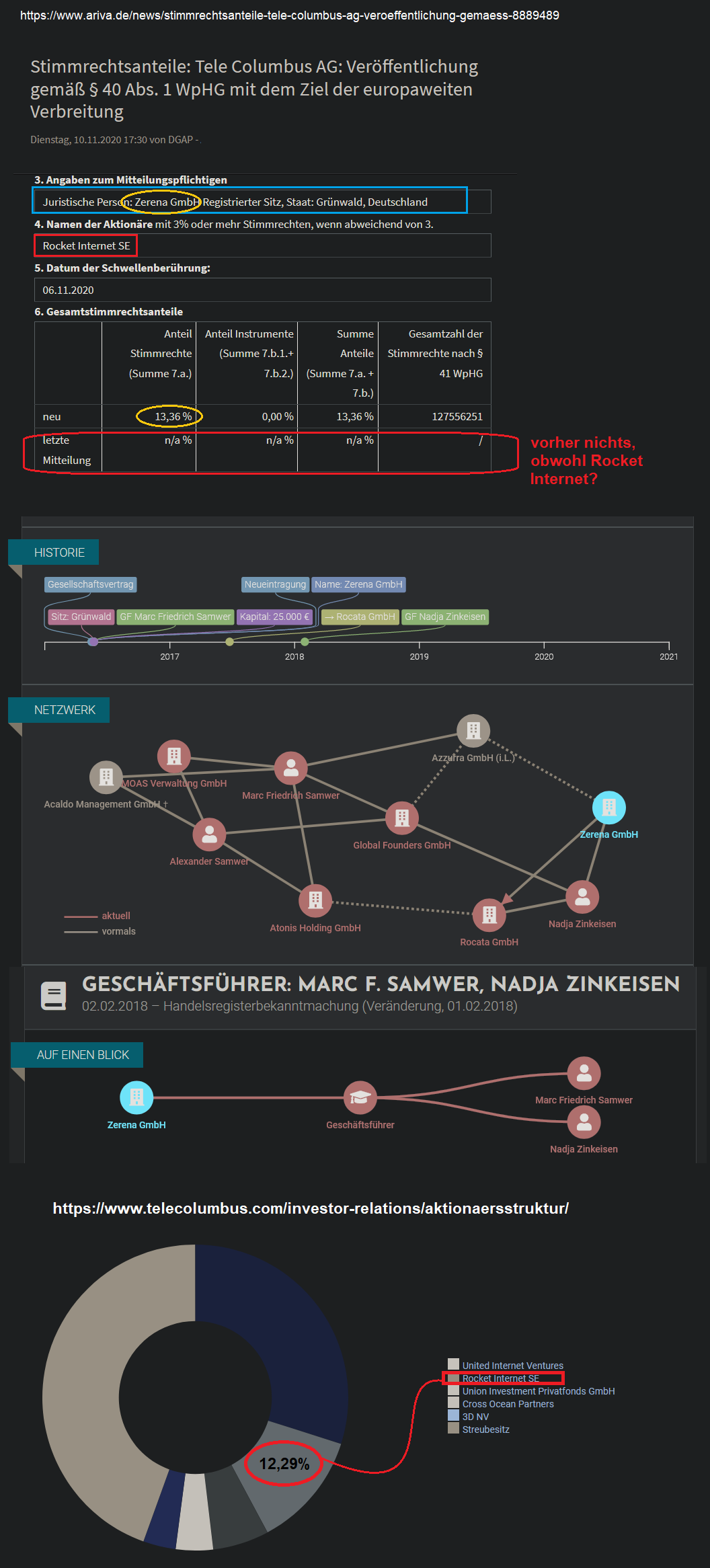 Die Aktionärsstruktur der TC zeigt auf der Homepage heute immer noch 12,29% für Rocket Internet SE an. Letzte Aktualisierung war am 7. Juli 2020. Die IR-Leute scheinen an wirklich aktuellen Zahlen wenig Interesse zu haben, denn da sollten jetzt eigentlich schon deine gezeigten 13,36 % für die Zerena GmbH auftauchen.