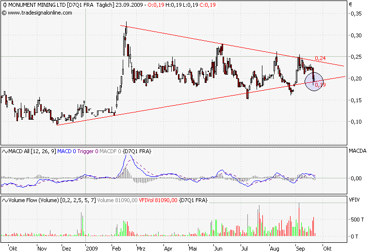 Prallt der Kurs jetzt ab läuft alles nach Plan und der Ausbruch aus dem Dreieck könnte beim nächsten Angriff auf die 25 cent fallen.