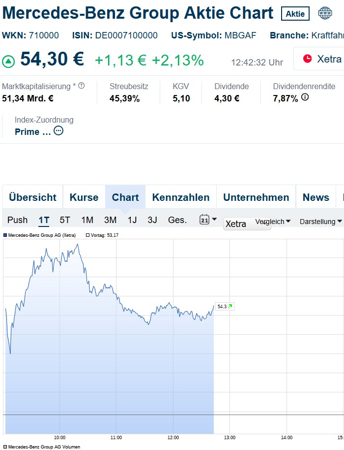 Zum Vergleich unten ein topaktuelle News zur Daimler-Benz-Group. Die Daimler-Aktie stieg heute um 2,13% auf 54 Euro, weil die Gewinnmarge höher als erwartet ausgefallen war: Sie soll nun bei 4 bis 6 % liegen, während die Erwartung bei 3,6% lag.