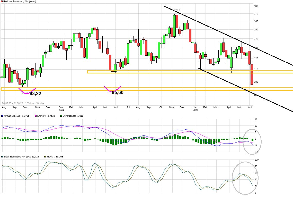 Die Aktie ist ja bekannt für größere Ausschläge, da eben viele Zocker und Trader sich da tummeln und weniger längerfristige ruhige Aktionäre. Da ist eben das alte Spiel aus Gier und Angst noch ausgeprägter als bei anderen Werten. Der Kurs ist wieder deutlich durch die 100€ gefallen und es gäbe jetzt wieder als mögliche "Fangleine" die horizontale Region um 93/96€. Sollte man sogar bei der weiteren Korrektur noch durch 93,22 fallen, dann wäre wohl eine weitere SL Welle zu erwarten in Richtung der Unterseite des eingezeichneten schwarzen Kanals. Man hat allerdings auch im Mai letzten Jahres gesehen wie schnell das YoYo wieder hochgelaufen ist, als man erst bis in den 95,xx Bereich gefallen war. Von daher schwer abzuschätzen was nun passiert. Wäre da jedenfalls im Moment etwas vorsichtig mit Käufen bis sich nicht etwas die Lage im Chart wieder klarer darstellt.