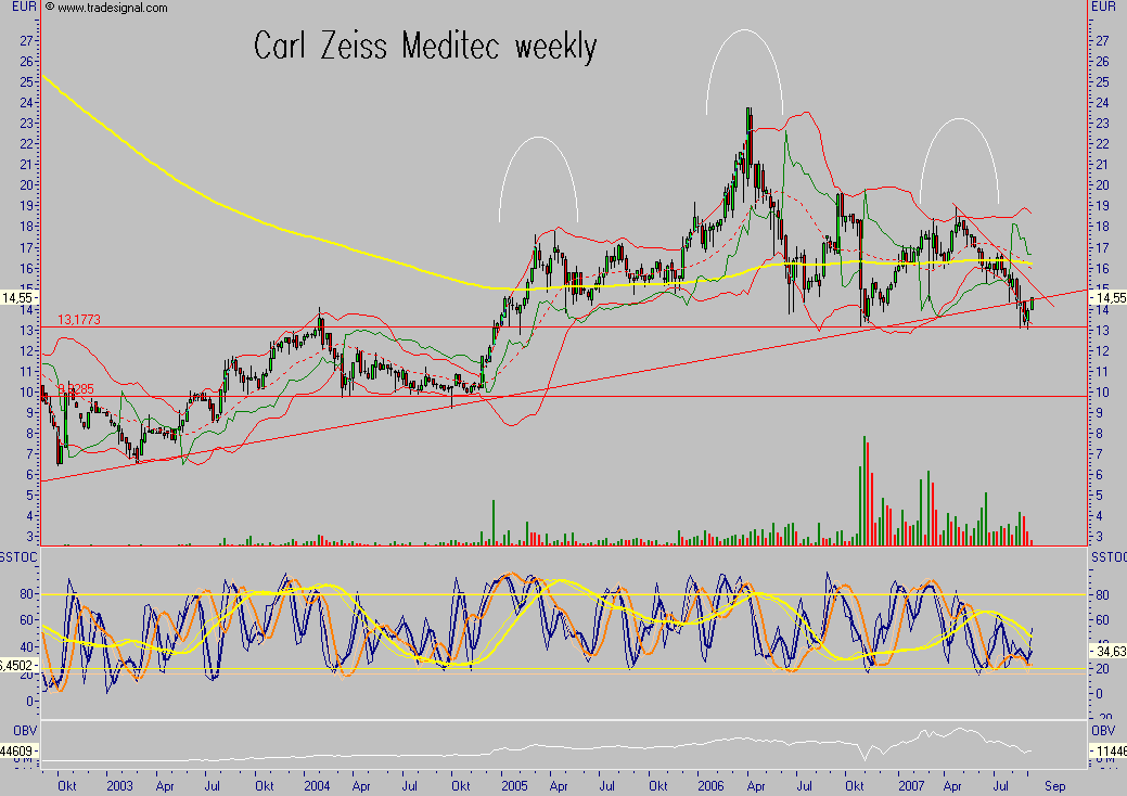 Könnte mir hier durchaus eine Erholung bis 96 vorstellen was gleichzeitig die Aufwärtstrendlinie und die untere Trendlinie des kurzfristigerem Abwärtstrendkanal ist. Das Mittelband der Bollinger verläuft ebensfall knapp unter diesem Ziel so bei 95.