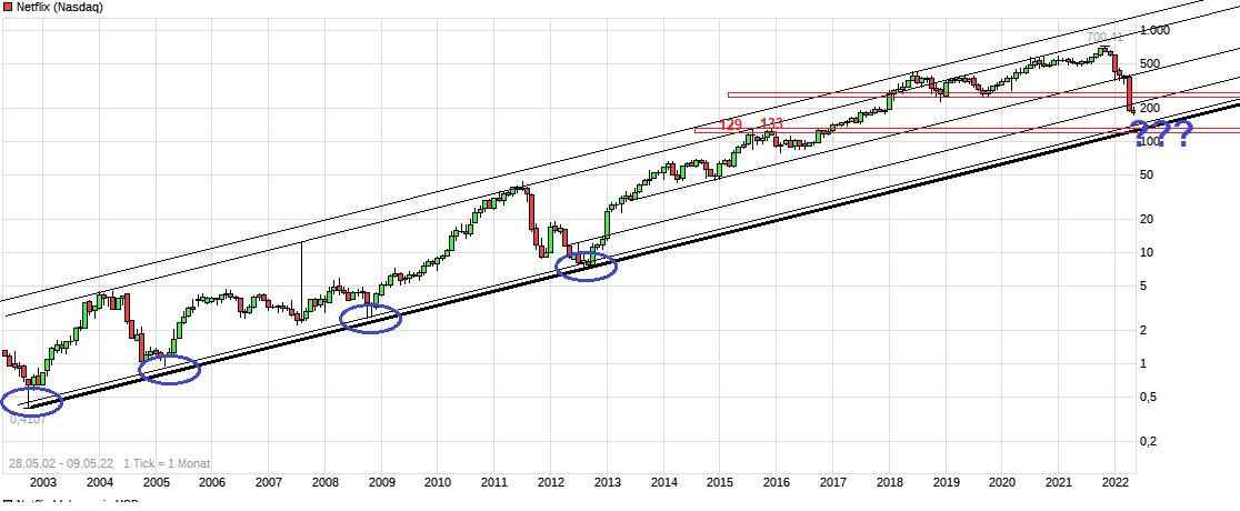 ....könnte man hier in der nächsten Zeit auch noch weiter Richtung 129/133 Dollar fallen, wo es dann wieder horizontale Unterstützung gäbe. Dann käme man zudem auch wieder in den Bereich des längerfristigen Aufwärtstrends. Könnte vielleicht passieren durch eine wieder verkündete enttäuschende Entwicklung der Kundenzahlentwicklung bei den nächsten Q. Zahlen. Die Probleme der Firma sind gravierend und werden nicht nach wenigen Monaten wieder verschwinden. ( =>https://www.boerse-online.de/nachrichten/aktien/...absturz-1031373779 "...der schwache Jahresstart dürfte zudem kein einmaliger Ausrutscher sein: Für das zweite Quartal rechnet Netflix jetzt mit einem Kundenschwund von zwei Millionen. Konzernchef Reed Hastings übt Selbstkritik: Das außergewöhnlich starke Wachstum im Corona-Jahr 2020 habe die Sicht auf die Marktentwicklung verschleiert. Die Rückgänge 2021 habe man durch Vorzieheffekte der Pandemie erklärt. Jetzt glaubt Hastings, andere Faktoren zu erkennen. Einer davon ist der verschärfte Wettbewerb durch Konkurrenten wie Disney. ..") Von daher dürfte Netflix selbst nach einer Bodenfindung auch nicht wieder im Sauseschritt kursmäßig nach oben eilen, da sich der Wettbewerb deutlich ändern und der temporäre "Corona-Boom" hier eben durch ist.