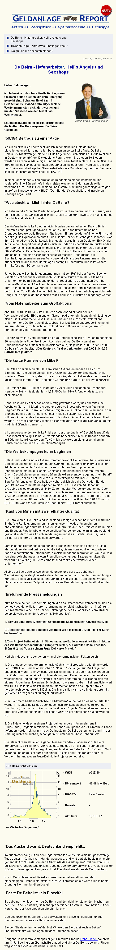 derzeit kursieren neue Gerüchte um angebliche Machenschaften rund um Herrn Eckhof und seine Unternehmen. Insbesondere wurde in einem Newsletter von heute "Finger weg!" bezüglich De Beira Goldfields getitelt.