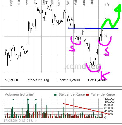 gestern wurde der weg der grünen Prognose-Linie bis runter zur Nackenlinie erfolgreich absolviert und diese mit dem nachfolgenden Anstieg als gültig bestärkt