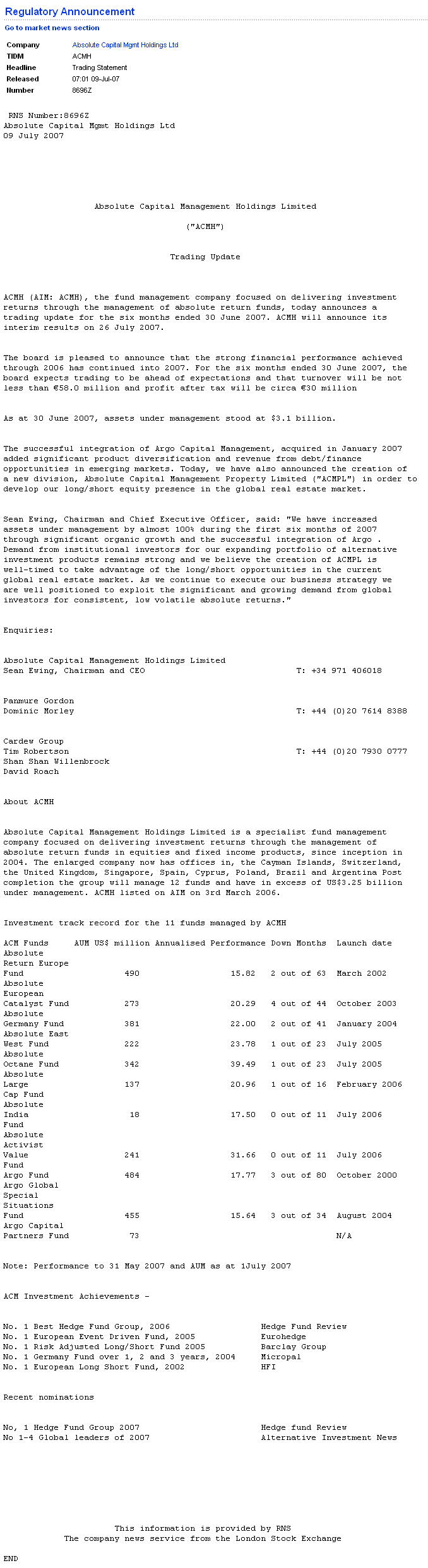 - zur Abcap-Aktie: Die Marktmeinung ist zur Zeit gegen alles was auch nur im entferntesten mit Hedgefonds in Verbindung steht, daher ist die momentane Aktienbewertung von Panik getrieben und hat keinerlei rationale Begründung (Kaufkurse)