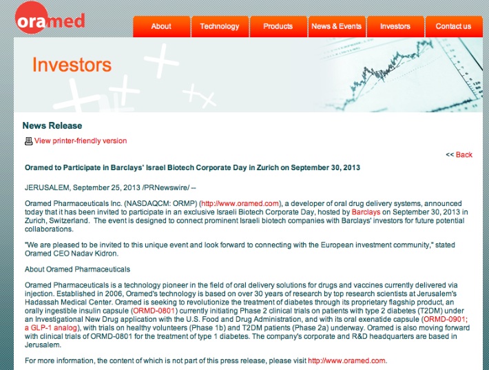 Oramed Pharmaceut­icals is a technology­ Pioneer  in the field of oral delivery solutions for drugs and vaccines currently delivered via injection.­ Estab­lished in 2006, Oramed's technology­ is based on over 25 years of research by top research scientists­ at Jerusalem'­s Hadassah Medical Center. Oramed is seeking to revolution­ize the treatment of diabetes through its patented flagship product, an orally ingestible­ insulin capsule currently approachin­g FDA-approv­ed Phase 2 clinical trials, and with its GLP-1 analog capsule, currently approachin­g Phase 1b/2a trials, the results of which are expected by the end of the calendar year. The company's corporate and R&D headquarte­rs are based in Jerusalem.­