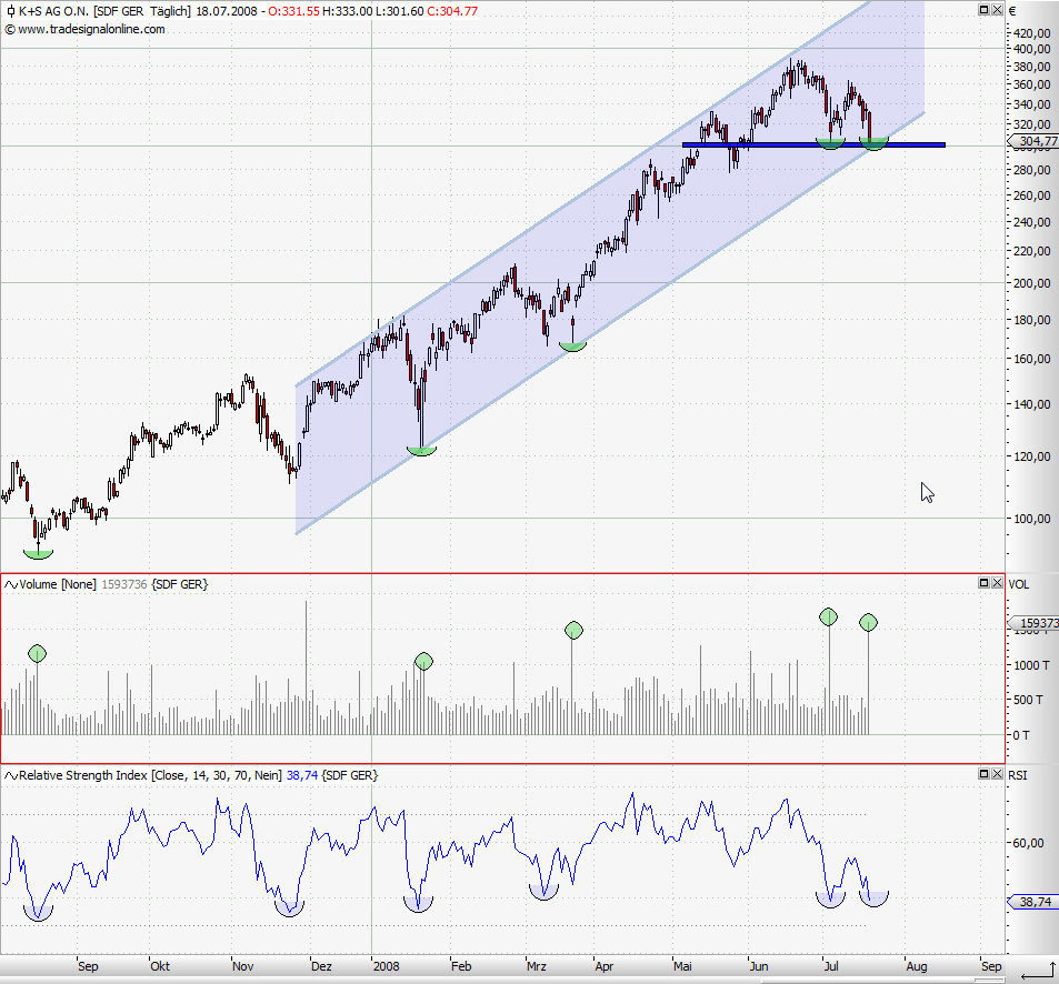 - dass der RSI im überverkauftem Bereich ist (schon unter 40) und wir Freitag einen sell-off mit rekordverdächtigen Umsätzen sahen (1,6 Mio stück!). Wer an diesen überverkauften, umsatzstarken sell-off "peaks" kaufte, hat bei k+s fast immer die tiefstkurse erwischt => siehe Chart