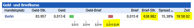 Es ist eine alte Börsenregel der Pennyflipper, niemals an einem Börsenplatz etwas zu machen, der illiquide ist, da er zügigen Kauf und Verkauf erschwert und da ein Pennystock Flipper anzieht wie ein Magnet, schrecken sie vor Berlin zurück und warten lieber auf die Amis. Dort wurden am Donnerstag 800.000.000 shares an einem Tag umgesetzt, niemandem fällt auf, wenn man sich wacker einkauft und wacker wirft, mit etwas profits, das ist Flippers heaven, Berlin ist flippers nightmare und die Leut sind ihrem Geld nicht böse, daher riskiren sie nichts, auch wenn sich das manche hier so sehr wünschen... die anderen sind nicht unbedingt dümmer oder unbedarfter als man selbst.