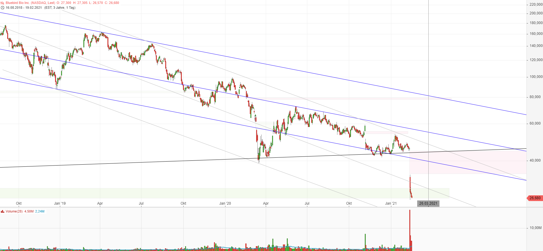Natürlich sind gestern die Analysten noch mit auf die News aufgesprungen und haben ihre Kursziele nach unten angepasst. Zwei weitere Biotechs sind im Fahrwasser von bluebird mit gefallen.