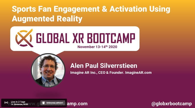 Der CFO von ImagineAR darf ebenfalls einen Beitrag beisteuern. Ich hoffe, dass die große Bühne der Bekanntheit des Unternehmens nochmals einen weiteren Schub gibt - hier schon mal der Link zum Vortrag "Sports Fan Engagement & Activation Using Augmented Reality":