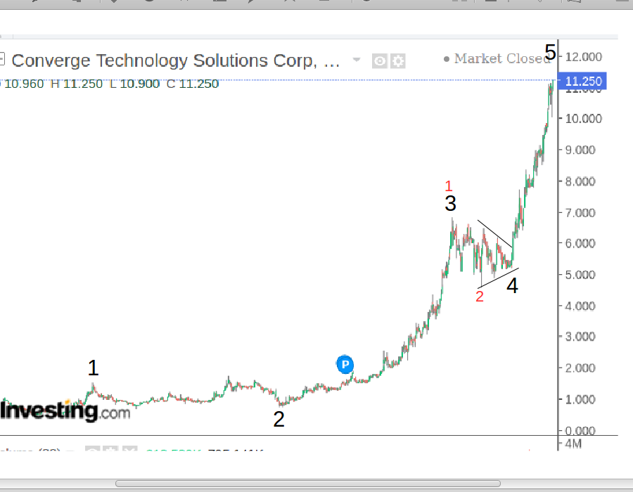 Welle 3 würde typischerweise bis 14,35 $ oder höher laufen. Der gesamte Impuls sollte es in diesem Fall schon bis 20 $ schaffen.