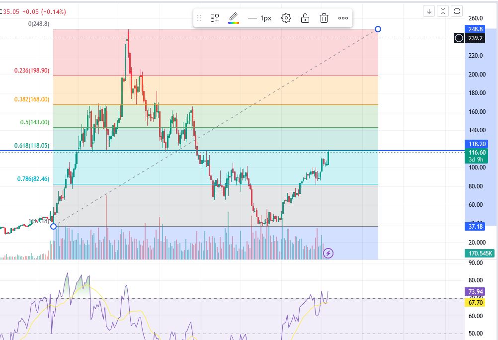 Ich bin zwar nach wie vor vom Unternehmen überzeugt, aber die 118 sollten ein ziemlich großer Widerstand sein, und der RSI deutet auch schon auf überkauft. Bei unter 100 würde ich wieder einsteigen.. mal sehen, ob ich richtig liege. Ansonsten sind 150% Gewinn auch nicht schlecht gewesen.