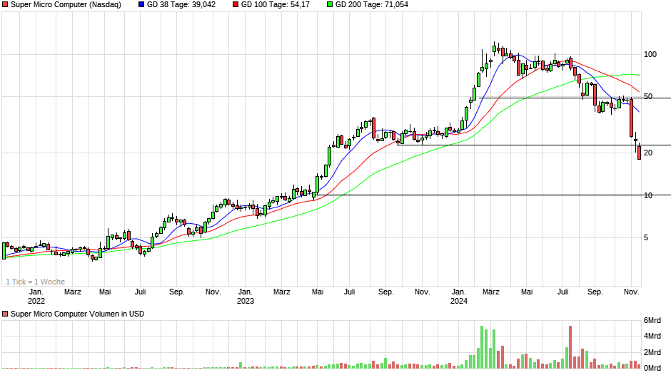 Der dramatische Kurssturz der Super Micro Computer-Aktie will einfach nicht zu Ende gehen. Am Mittwoch sackte die Aktie des Serverherstellers um weitere -6% im US-Handel auf ein neues Jahres- und zugleich 12-Monatstief ab. Verlassen Anleger hier ein sinkendes Schiff oder hat Super Micro Computer noch eine Chance auf eine Stabilisierung?