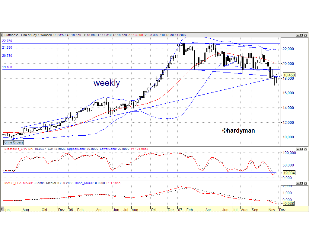 Haben sich jetzt um die 18 vorerst stabilisiert, was die letzte Haltemöglichkeit sein dürfte. Schön zu sehen im Wochenchart.