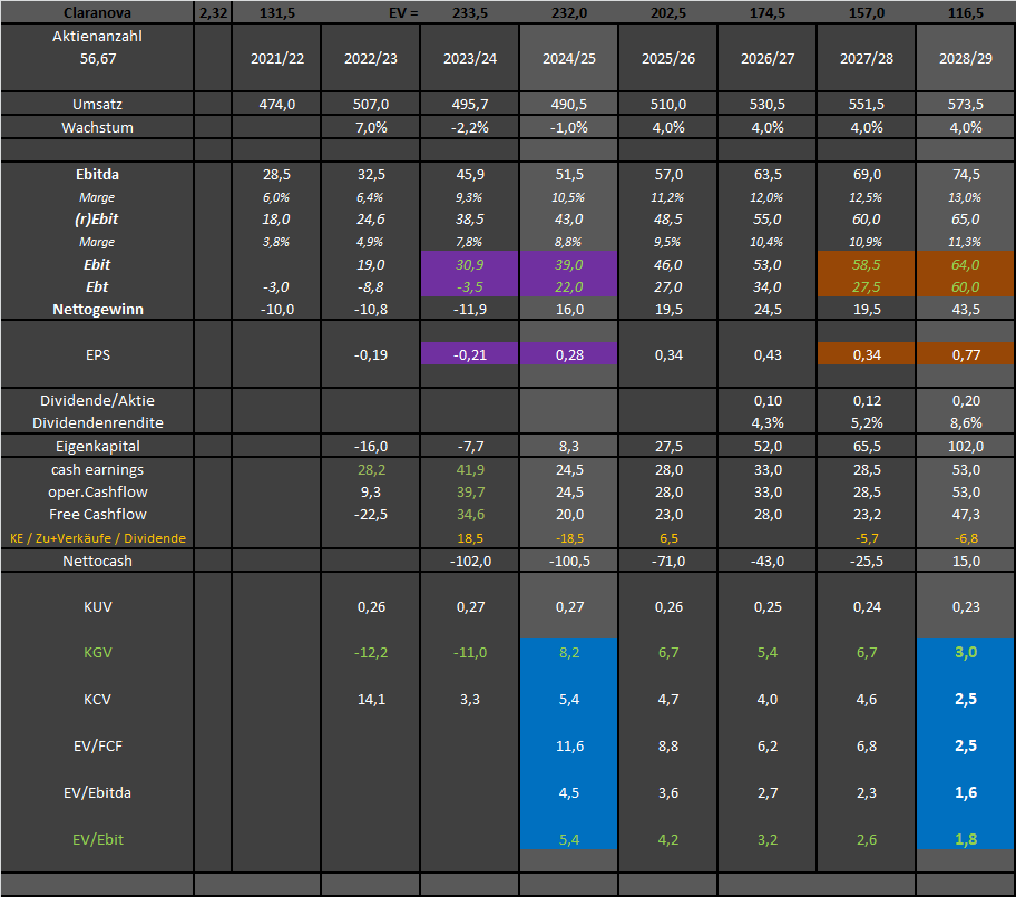 Ich weiß jetzt nicht wie du genau deine Nettozinskosten berechnet hast, aber um in deinem Beispiel für 2025/26 von 34 Mio Ebitda und 27 Mio (r)Ebit auf 20,4 Mio Ebt zu kommen, musst du ja dann mit erheblichen Zinseinnahmen von 10-12 Mio kalkulieren, da die Zinsaufwendungen laut Vorstand fürs kommende Jahr bei 19 Mio liegen, plus 1-2 Mio sonstige Finanzeffekte.
