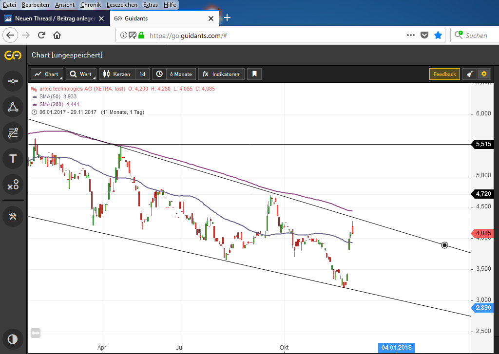 Gehts noch weiter? Jetzt noch ein Sprung über die Abwärtstre­ndlinie in Richtung 4,35/4,70€­, dann könnte der Abwärtstre­nd überwunden­ werden. Jedoch wartet auch eine ganze Menge Widerstand­... 200 Tage gerade über der Trendlinie­, 4,70€ und 5,15€. Wünsche allen Investiert­en viel Erfolg!