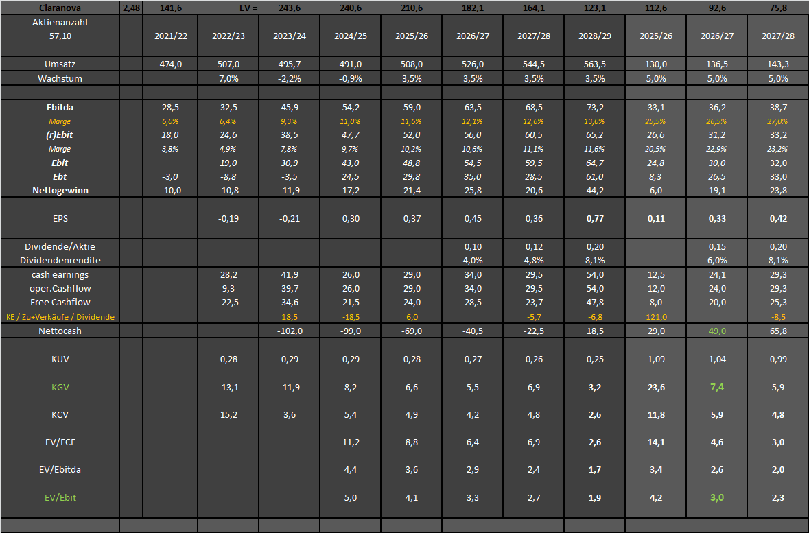 Selbst beim aktuellen Kurs von 3,12 € hätten wir fürs Gesamtjahr 26/27 (das in knapp einem Jahr beginnt) ein EV/Ebit von 4,6 ohne PA und EV/Ebit von 4,1 mit PA.