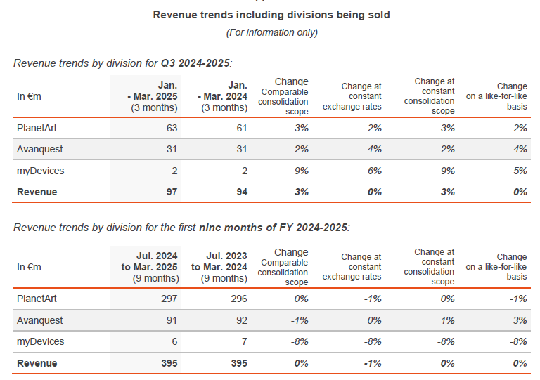 Claranova (Euronext Paris: FR0013426004 - CLA) gibt bekannt, dass die Gespräche mit dem Atlantic Park Fonds von General Atlantic Credit und dem Managementteam von PlanetArt über den möglichen Verkauf der PlanetArt-Sparte, der am 3. März 2025 angekündigt wurde, voranschreiten. Die endgültigen Bedingungen für den Verkauf stehen jedoch noch nicht fest.