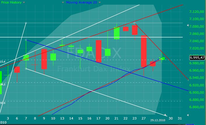Letzter Börsentag im Jahr 2010. Alles in Allem war es ein gutes Börsenjahr. Die Wirtschaft konnte sich dank massiver Massnahmen erholen, ganz speziell hiervon hat es unser Land betroffen. Es ist schon ein Unterschied ob man eine starke Wirtschaft besitzt, dadurch aber zu früheren Zeiten auch eine pickelfeste Währung (DM), dadurch mittelfristig aber wieder Nachteile besitzt. Oder aber man hat eine starke Wirtschaft und eine schwache Währung (Euro), dann kann es brummen und nicht zu knapp .