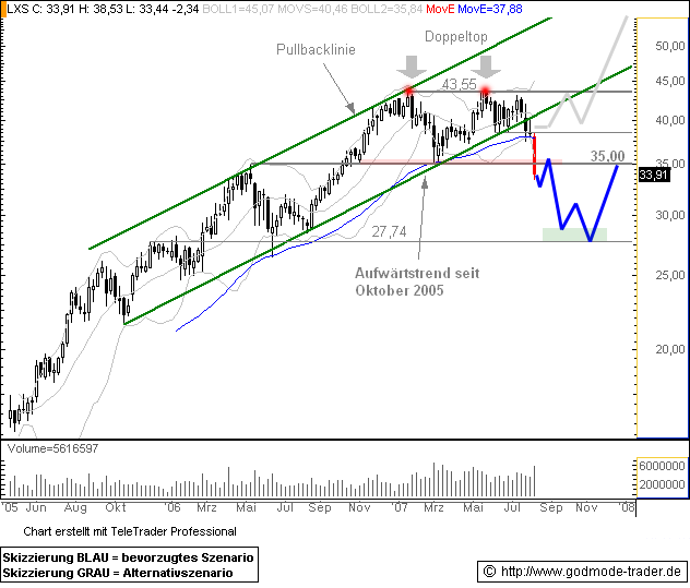 Rückblick: Die LANXESS Aktie markierte nach mittelfristiger Kursrallye ein Allzeithoch im Januar 2007 bei 43,90 Euro und korrigierte anschließend bis an die 35,00 Euro Marke zurück. Im Mai erreichte sie dann erneut die 43,90 Euro Marke und prallte nach unten hin ab. Mit dem Bruch des Aufwärtstrend im Juli generierte sie schließlich ein Verkaufsignal, welches die Aktie wie in unserer letzten Analyse rechtzeitig angekündigt (s. angehängte Chartgrafik) deutlich abrutschen ließ. Heute unterschreitet sie intraday auch die 35,00 Euro Marke. Das kurzfristige Chartbild ist bärisch, das mittelfristige neutral zu werten.
