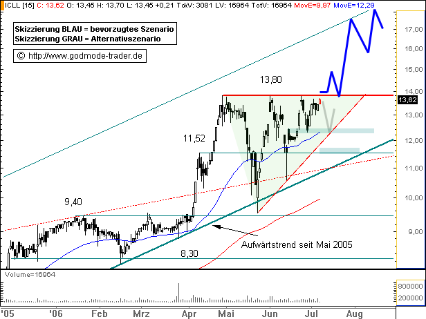 Die INTERCELL Aktie brach im April über den Widerstand bei 9,20 Euro aus und vollzog eine Kursrallye auf ein neues AllTimeHigh (13,80 Euro) im genannten Zielbereich bei 13,00 - 14,00 Euro. Die "letzte Meile" zur Oberkante des Aufwärtstrendkanals seit Mai 2005 bei 14,61 Euro wollte die Aktie dann nicht mehr laufen und startete eine volatile Seitwärtskorrektur. Diese verläuft in einer dreiecksförmigen Handelsspanne, deren obere Begrenzung die 13,80 Euro Marke und die untere der Aufwärtstrend seit Mai 2005 darstellt. Aktuell attackiert die Aktie wieder das AllTimeHigh bei 9,20 Euro. Das Chartbild ist auf sämtlichen Zeitebenen bullisch zu bewerten.