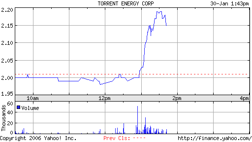 Vancouver, British Columbia - January 13, 2006 - Torrent Energy Corporation (the "Company") (OTCBB:TREN) is pleased to announce the following developments from its wholly owned operating subsidiary, Methane Energy Corp. ("Methane").