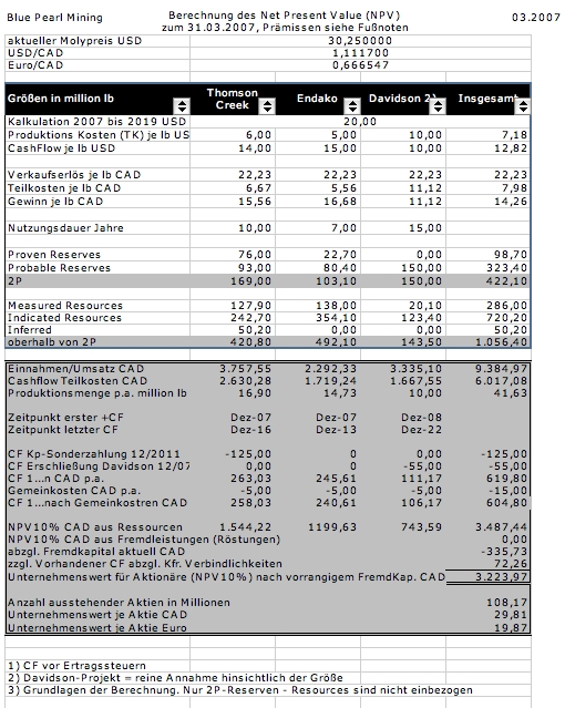 Da ich weiß, dass es einige unter den Nägel brennt, habe ich die Bewertung neu durchgerechnet und insbesondere die Gemeinkosten von den Produktionskosten getrennt. Auch wenn mir noch die aktuelle Zahl zum "Working-Capital" fehlt, kann ich verraten, dass auf Basis eine Molypreises von 20 USD für den Betrachtungszeitraum und bei Zugrundelegung der schon in der letzten Berechnung zu Davidson gemachten Größenannahmen bezogen auf die Zahl der umlaufenden Aktien von einem Unternehmenswert von rd. 33 CAD je Aktie ausgegangen werden kann. Dieser Betrag kann zur Orientierung als Kursziel dienen. Wobei noch einmal festzuhalten ist, dass die Nennung eines Kurszieles keine Prognose darstellt und Formulierungen wie "Zielprognose" und "Zielpräzision" grober Unfug sind.