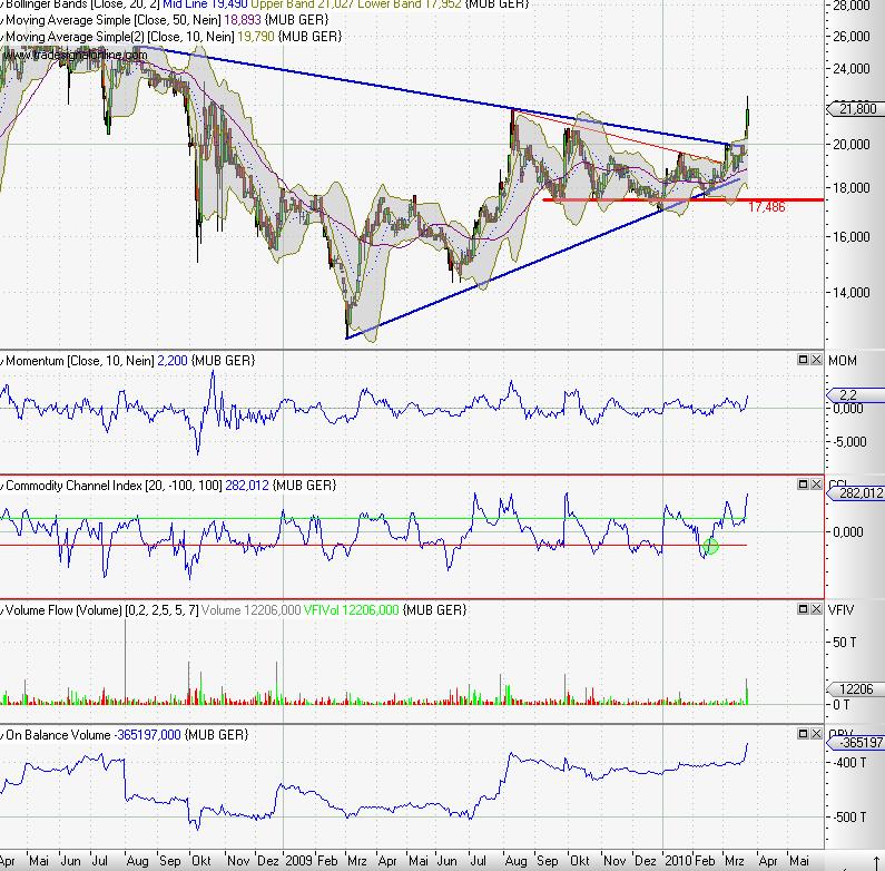 Und die Aktie legt bereits im Vorfeld ordentlich zu. Meine Vermutung lautet daher: Die Zahlen werden sehr positiv sein. Mit einigen großvolumigen Aufträgen im Rücken, wird Mühlbauer seine Marge sicherlich wieder auf ein Niveau schrauben können, das an alte Zeiten errinnern lässt. 15-20% beim EBIT. Ich rechne mit knapp 45-50Mio Umsatz und einem EBIT von etwa 7-8 Mio. Alles in Allem kann das Jahr 2010 ein Rekordjahr werden und die Aktie macht sich auch so langsam auf den Weg dieses Szenario einzupreisen.