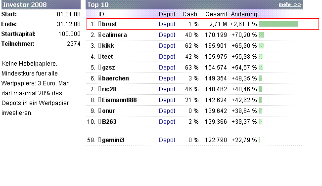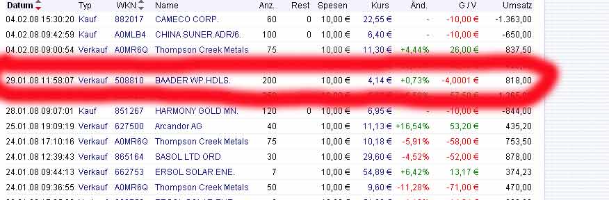 Fehlende Transaktionen Wir haben ein seit Dezember 2007 aktives, fehlerhaft­es Bereinigun­gsskript identifizi­ert, das Käufe inclusive zugehörige­r Verkäufe löscht, wenn der Kauf einen negativen "noch verblieben­" Bestand aufzeigt. Gerade bei extrem hohen im Trader-Bör­senspiel gehandelte­n Stückzahle­n kommen durch Rundungsfe­hler geringe Negativbes­tände allerdings­ gelegentli­ch vor.