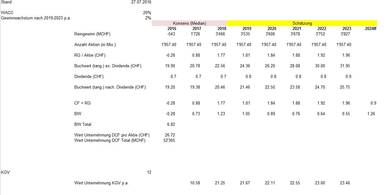 Wie unschwer zu erkennen ist, wäre mit der aktuellen Konsenschätzung 2016-2018 ein Wert zwischen CHF 20.- und CHF 30.- realistisch. Der aktuelle Kurs CHF 11.48 (Stand 26.07.16 cob) ist somit in meinen Augen von Panik getrieben und wesentlich zu tief.
