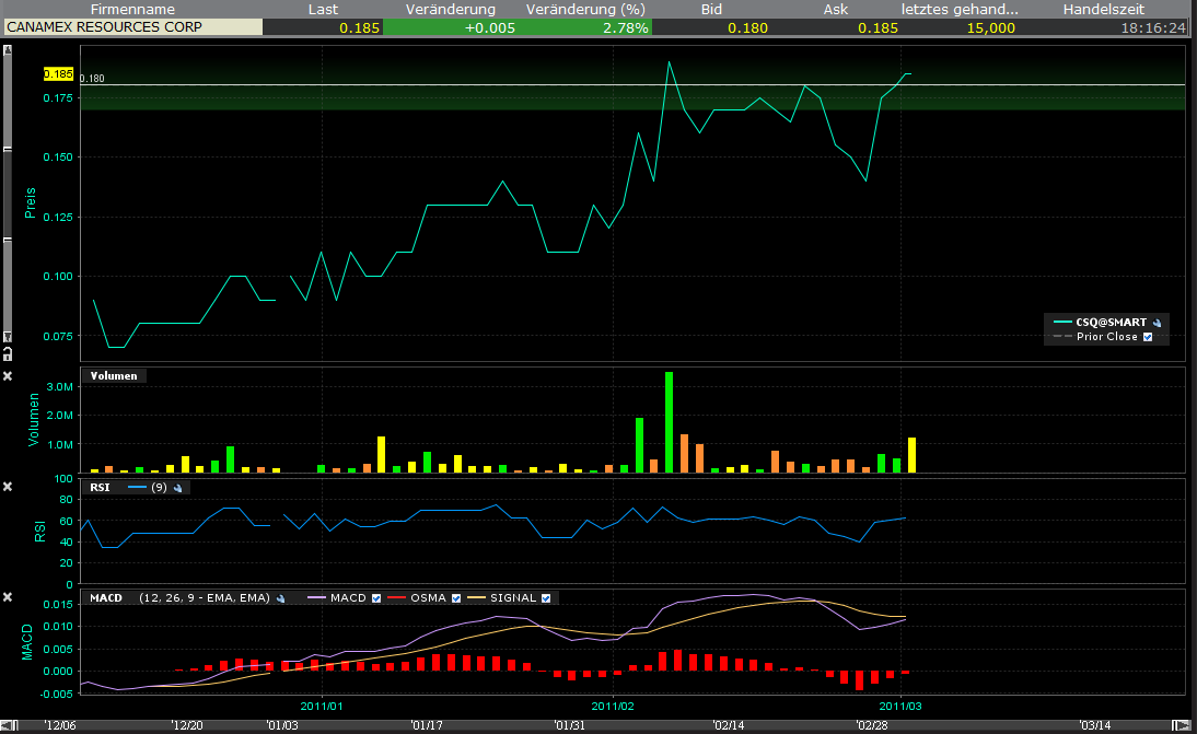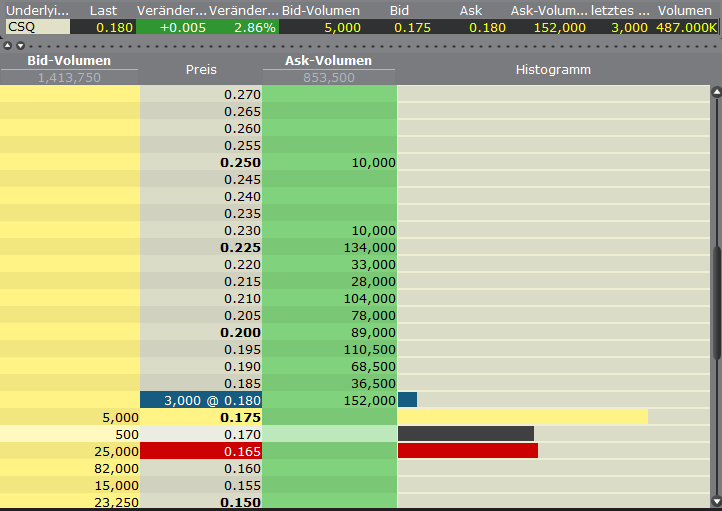Ein Blöckchen von über 150k im Ask zu 0.18 CAD. Höher darf Canamex heute nicht steigen, obwohl das BID-Volumen schon deutlich über dem ASK-Volumen liegt.