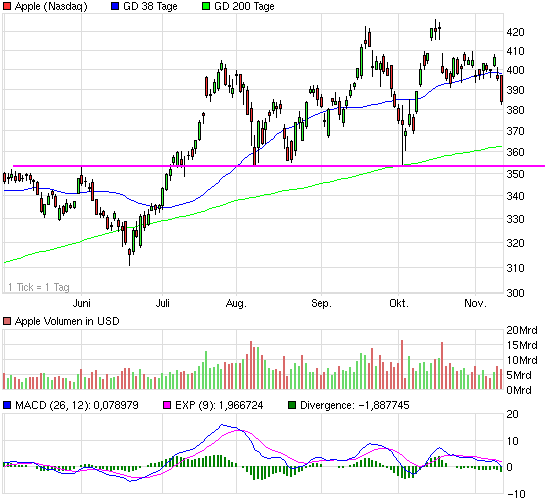 Bei Rücksetzern kann man hier meiner Meinung nach kurzfristig einsteigen, aber mittel- bis langfristig würde ich in Apple keinen Cent investieren. Schaut euch lieber mal Samsung an...