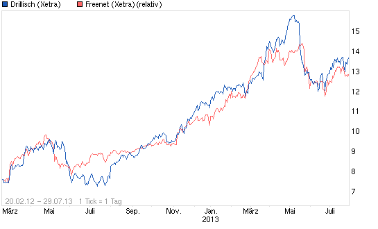 Also das Thema Fusion FNT u. DRI sehe ich völlig unabhängig von dem Thema e+/O2. Das Thema DRI u. FNT war schon 2007 auf der Agenda ( http://www.welt.de/welt_print/article1210986/...her.html?config=print ) und wurde jetzt eben auch von DRI aufgegeben nachdem UI schon vor längerem sich davon wieder distanziert hatte. Das O2 mal e+ übernehmen würde war eigentlich klar. Die beiden Seiten haben doch schon seit langem verhandelt und in der Branche wußte das auch jeder. Das wußten also auch der DRI und der FNT CEO schon und trotzdem haben sie nun keine Fusion vorangetrieben, sondern das Gegenteil gemacht. Zeigt doch auch, daß für sie das Thema Fusion e+/O2 kein Grund wäre ein eigenes Zusammengehen deswegen zu betreiben. P.C. hat sich ja relativ klar dazu geäußert und der starke Abbbau der FNT Beteiligung von DRI in den letzten Monaten zeigt ja auch, daß hier das strategische Vorgehen beeendet wird und sich DRI wieder mehr auf sich selber fokusiert. (http://www.platow.de/...-wachstum-und-dividende-zugleich/4143898.html 25.3.2013 . Die üppige Kapitalausstattung ist unter anderem auch der lukrativen Beteiligung an Freenet geschuldet. Diese haben die Maintaler allerdings vor wenigen Tagen überraschend halbiert. Statt rund 20,8% hält Drillisch jetzt nur noch 10,4% an Freenet. Damit wird eine Fusion immer unwahrscheinlicher. „Eins plus eins ergab hier eben nicht zwei Komma x“, konstatiert Choulidis, der erwartungsgemäß sehr viele Nachfragen zum Themenkomplex Freenet beantworten muss...."). Zudem ist es ohnehin wohl für FNT und DRI gut, wenn e+ künftig nicht mehr diesen destruktiven Preiskrieg jetzt weiter antreiben wird wie in den letzten 18-24 Monaten. O2 fand das auch nicht gut was e+ machte, da sie dadurch auch gezwungen waren auf das destruktive Vorgehen von E+ mit eigenen Preissenkungen zu reagieren und sich ihr Gewinn damit reduzierte. Somit dürfte sich der Preisverfall künftig nun langsamer fortsetzen (falls das Kartellamt grünes Licht gibt) und es damit auch dem ARPU von DRI zugute kommen.