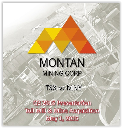 VANCOUVER, Aug. 6, 2015 /CNW/ - Montan Mining Corp. (TSXv: MNY) (FSE: S5GM) (the "Company" or "Montan") is pleased to announce the signing of a Mineral Processing Memorandum of Understanding (the "MOU") between Intigold Mining S.A. ("Intigold"), a Peruvian-owned private company, and Compañia Procesadora Mollehuaca S.A.C. ("CPM", a Peruvian-owned private company being acquired by Montan through the definitive agreement with Goldsmith Resources S.A.C.) to provide a stable supply of 60 tonnes per day ("tpd") increasing to 90 tpd of stockpiled material from Intigold's wholly owned Mina Calpa project for treatment at CPM's mineral processing facility near Chala.
