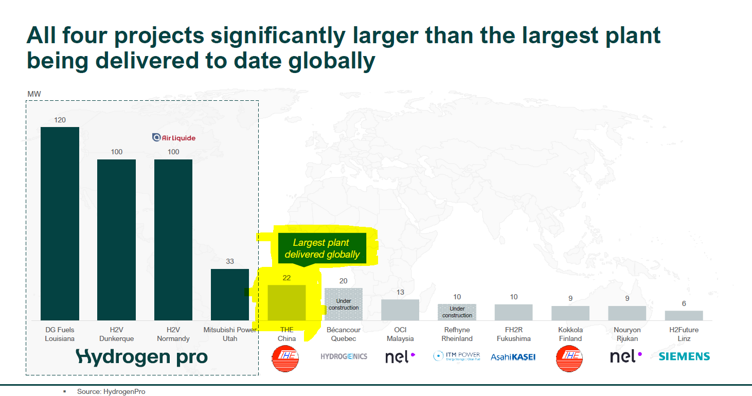Die Weltweit größte, bisher ausgelieferte Elektrolyseur Fabrik hat eine Leistung von 22MW, daher ist es vom Verfasser nicht falsch zu sagen, es wird der weltweit größte H2-Plant mit 24MW Leistung produziert. Der Beitrag ist dennoch irreführend, da sogar heute die Nachricht mit der Absichtserklärung über die 100MW Anlage in Hamburg kam. Handelsblatt Redakteure machen nicht immer die besten Beiträge--->es gibt immer Patzer. Habe die Grafik noch einmal angefügt um das noch einmal zu belegen.