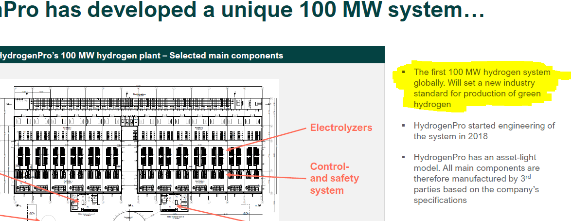 Ich hoffe man erkennt die Schrift, denn es handelt sich bei den 100MW Systemen von HYPRO um die ersten ihrer Art. ITM Power hat z.B. durch das Refhyne Projekt Informationen für ein solches System gesammelt, jedoch noch keine Aufträge in der Größenordnung (bzw. Ich weiß nicht ob sie ein solches System überhaupt schon anbieten)