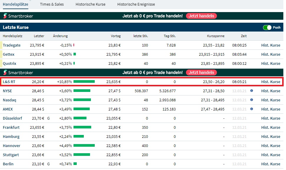 hoffentlich hast du Freitag nicht das nachlegen verpasst. Ich war bei den enkeln und kam erst spät nach Hause, bin aber noch zu 20,40 reingekommen. Bis ichs meiner Tochter erzählen konnte, kam sie nur noch zu 21,70 rein. Schade. Aber gegenüber letzter Wochenmitte immer noch ein sehr guter Preis zum nachlegen. Hab mich dafür aber von ROYAL DUTCH SHELL trennen müssen, aber egal.