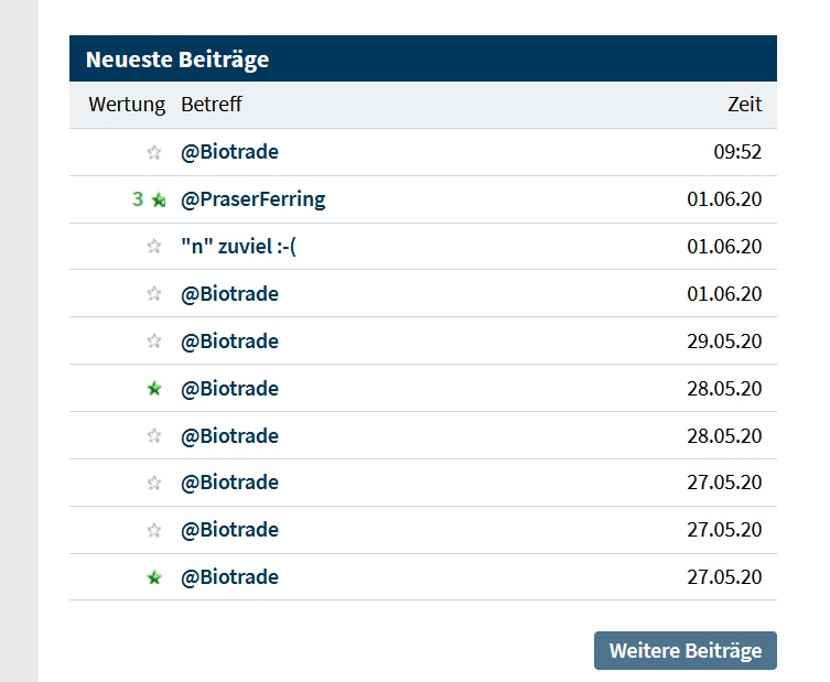warum regt ihr euch über Captain Biotrade so auf ? Er ist niemals ein sinnloser shitposter oder Basher, sondern reagiert halt schnell und ändert seine Meinung und tradet seine Aktien. Ist doch sein gutes Recht oder? Ich für meinen Teil bin lieber long bei meinen Investments, weil traden einfach nichts für mich ist und ich überhaupt keine Zeit bzw. Nerv dafür hätte.