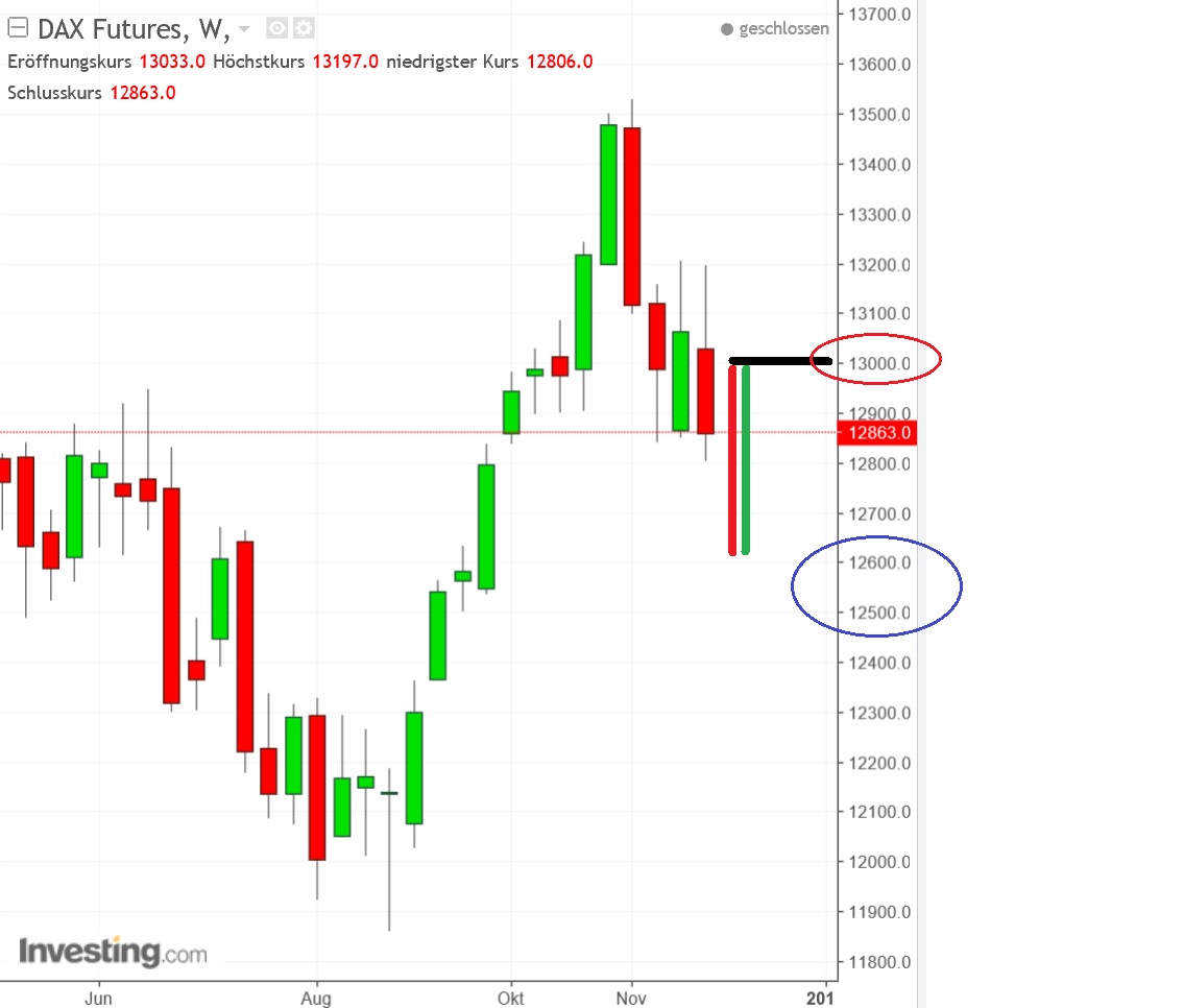 DAX heute nach Bruch der 13.030 bis 12.810 alle Unterstützungen ausradiert und dann wieder bis nahe Ausbruchskante gestiegen.