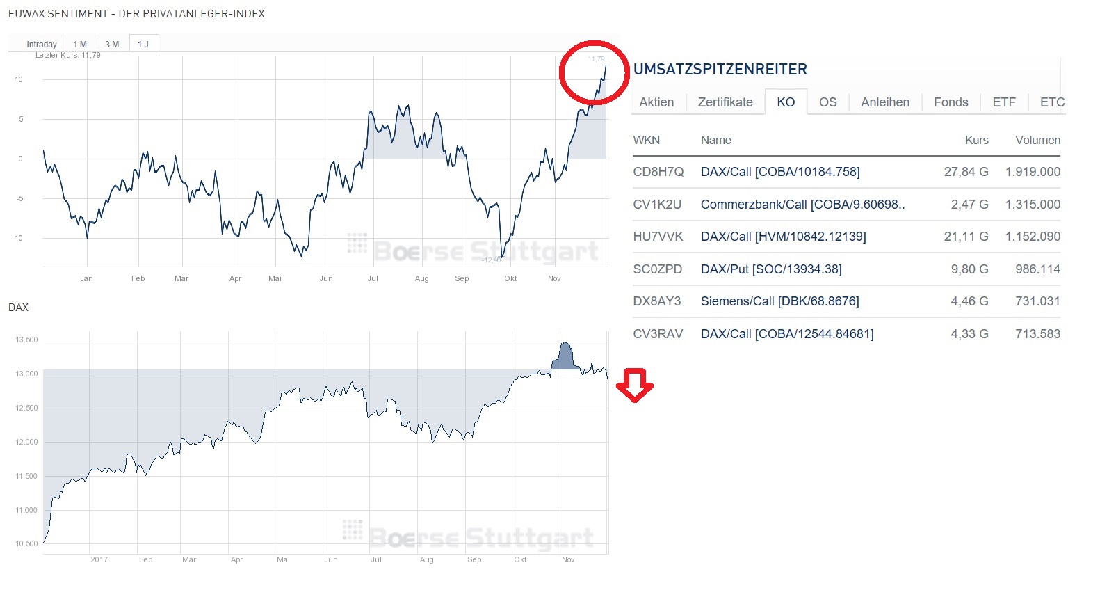Durch den hohen Longanteil im Sentiment gehe ich von weiteren Abgaben entgegen der Annahme der Jahresendrally aus.Es erwarten zuviele die Rally und haben sich vielleicht zu früh positioniert.Im Extremfall prügeln die Stillhalter den Kurs bis auf die 12350 runter um soviele Stopps wie möglich zu holen.Es ist schlichtweg einfacher den Kurs von unten nach oben laufen zu lassen zu der Zeit,als den Kurs 13200 oder höher nach unten zu bringen.Also Vorsicht auf beiden Seiten angesagt.Brechen wir durch die 800 sind Shorts die bessere Variante und wenn das Sentiment ins negative dreht mal nach Marken und Einstiegen für Longs suchen und zuschauen.